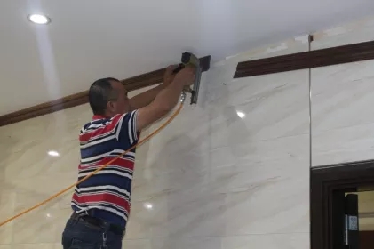 主要的施工工具和耗材有:合金鋸片,用于集成墻面板材的切割;專用鋼釘,在集成墻面邊緣的扣板位置將鋼釘打入墻體,把集成墻面固定在墻面上;耗材有美縫劑、專用膩子膏等,用于集成墻面的轉(zhuǎn)角、收邊等細節(jié)處理,使得整體更加的美觀。